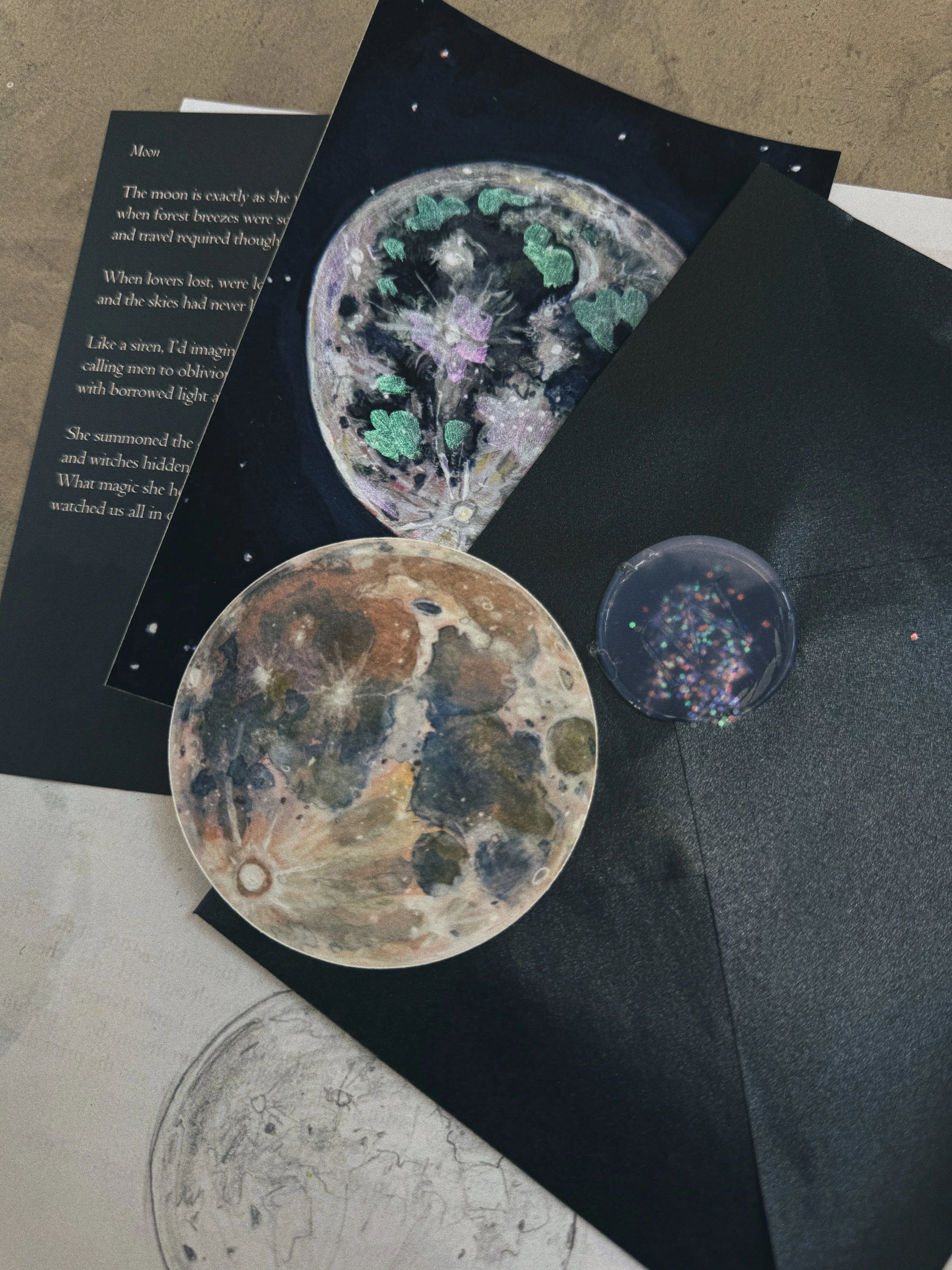 In a world of constant noise and endless distraction, we all crave presence — a chance to slow down, to hold something real and intentional in our hands. The Studio Post is my answer to that longing: a seasonal parcel of art mailed directly from my studio to your door. Each envelope carries a fine art print, a poem, a sticker, and a letter — lovingly crafted and curated to bring us both back to the rhythms of nature and of the stars.
